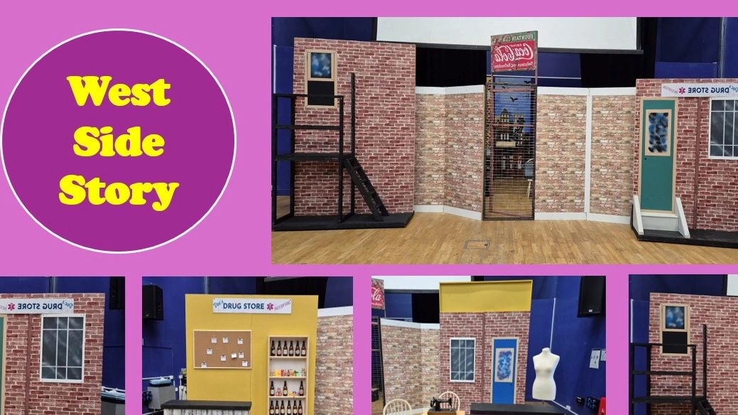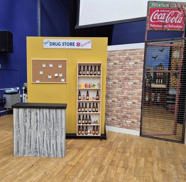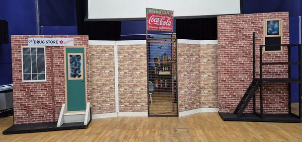 Brickwork fixed backdrop with advertisement sign above. Front of drugstore and balcony for Maria.